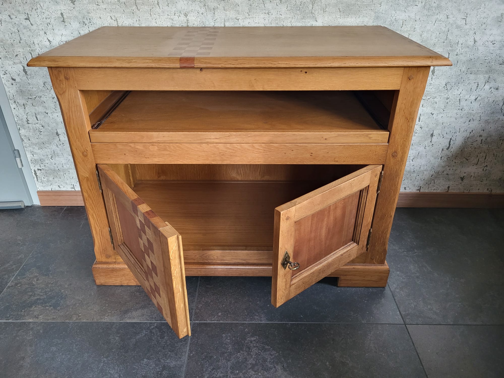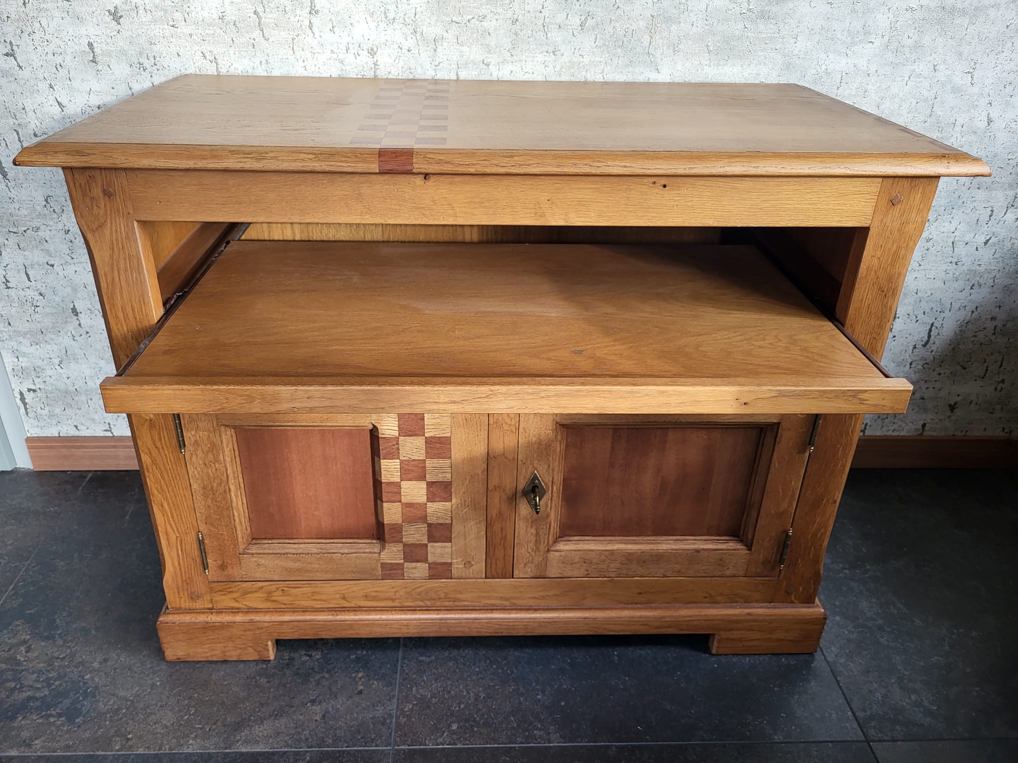 Tv‑kastje verrijkt met een doorlopende strook dambordpatroon die elegant over het bovenblad en de deur doorloopt.
