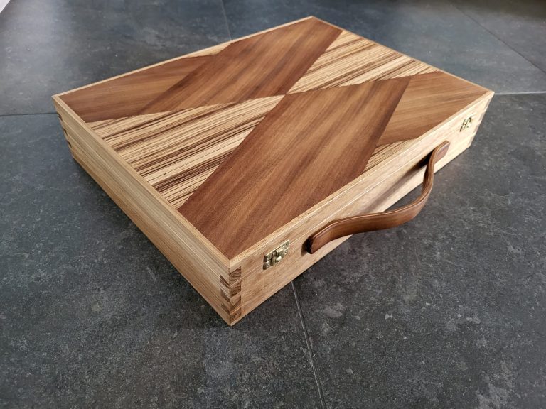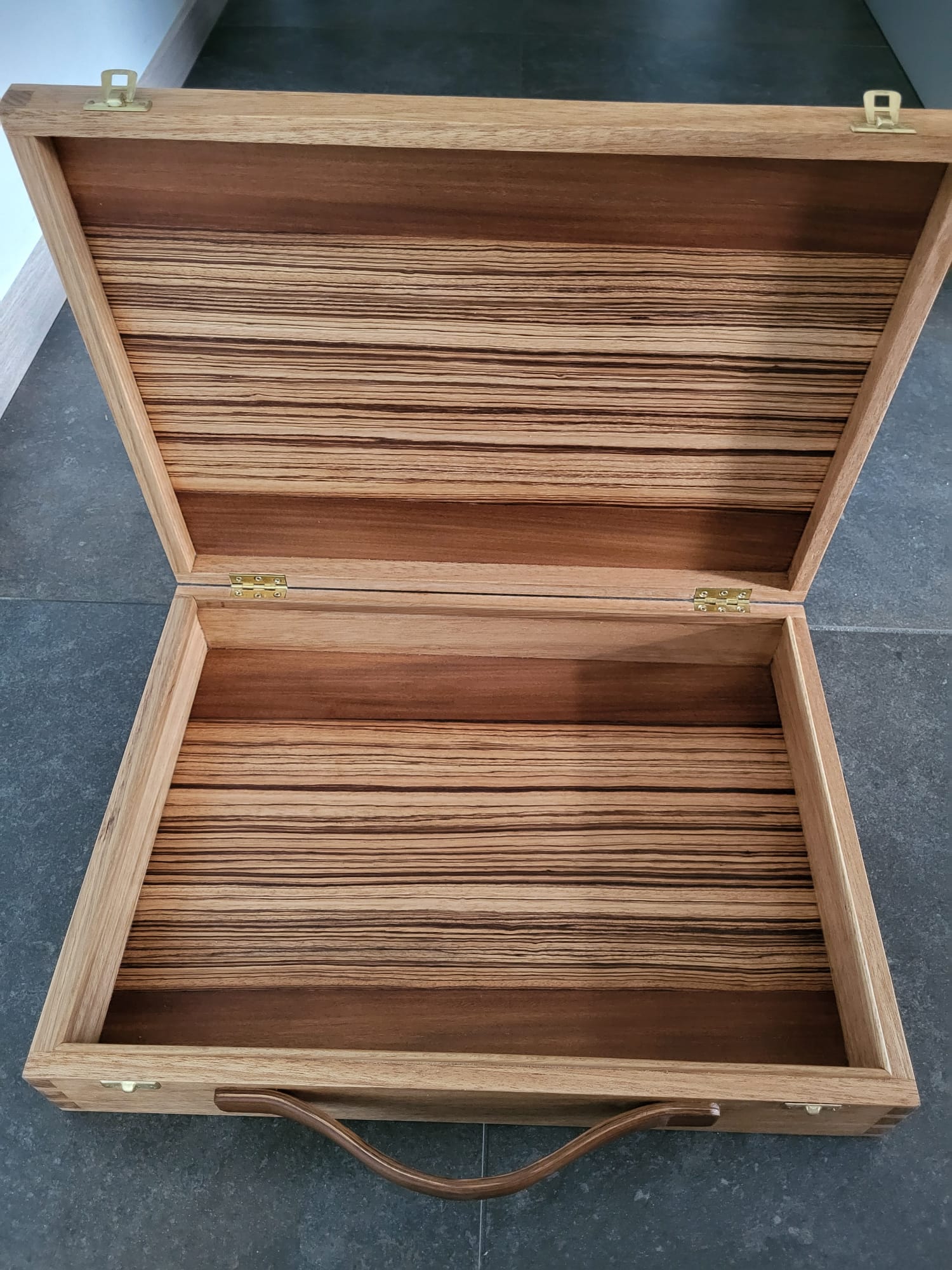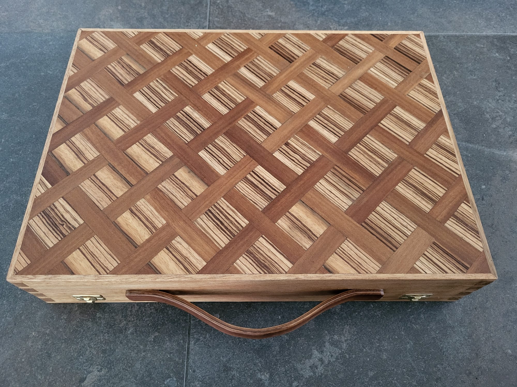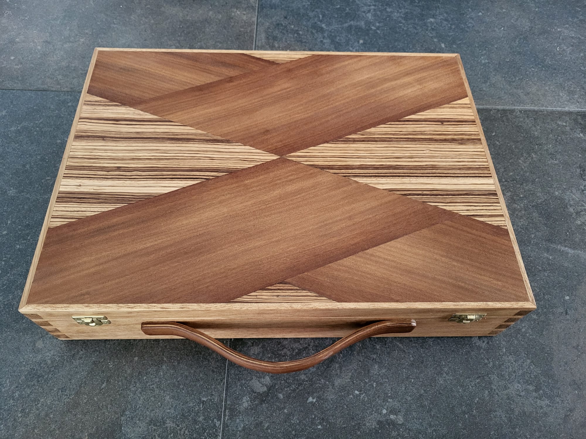 Deze koffer is bekleed met zorgvuldig aangebracht houtfineer, waardoor elk oppervlak een unieke tekening en warme uitstraling krijgt.