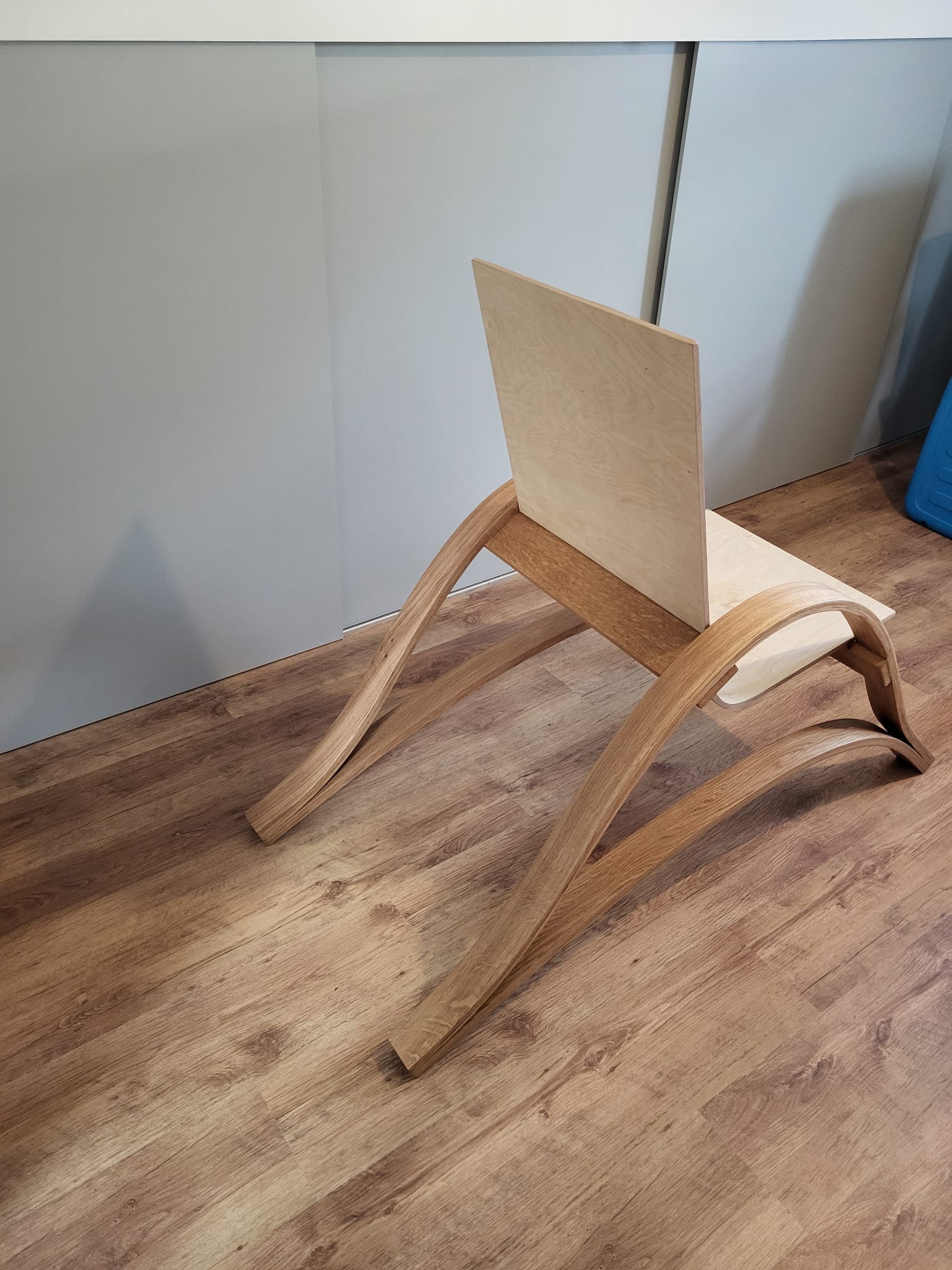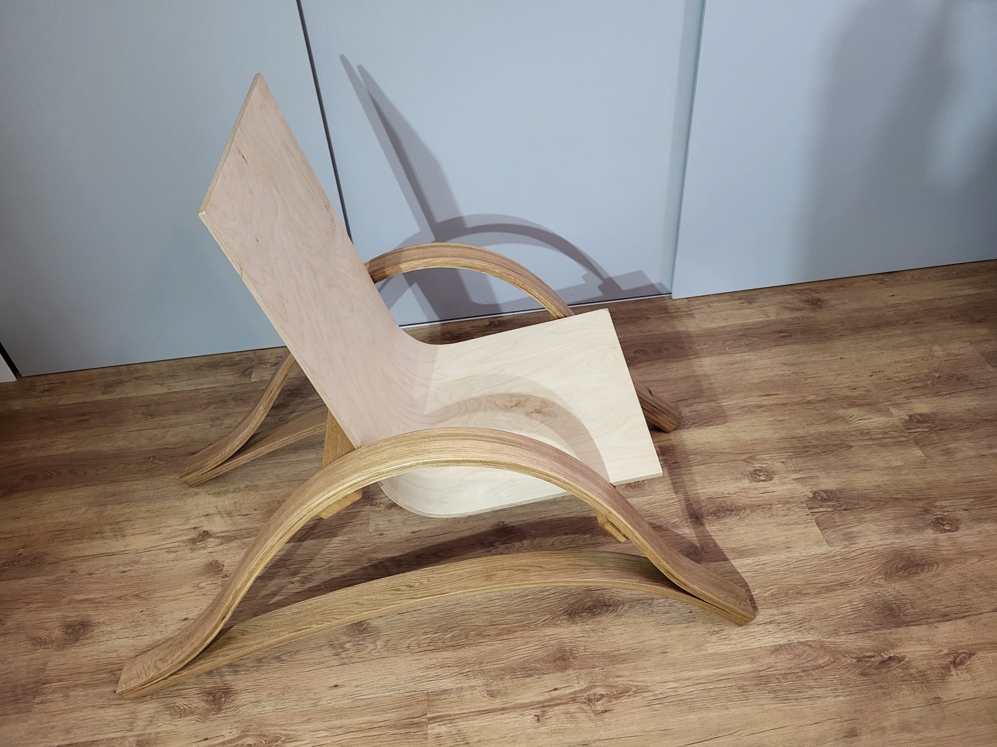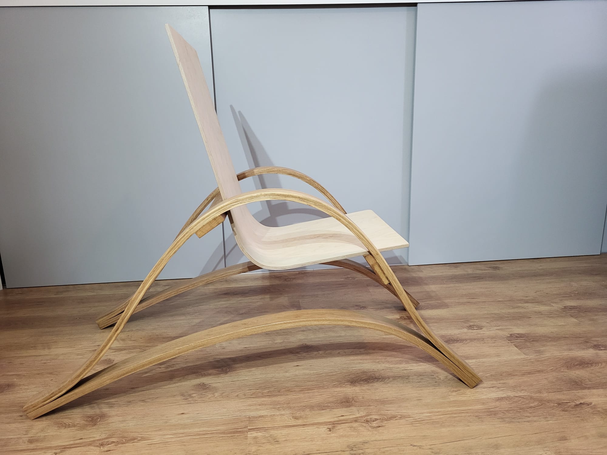 De vloeiende lijnen van het gebogen hout geven deze stoel een warme, organische uitstraling. Een tijdloos ontwerp dat rust en verfijning uitstraalt.