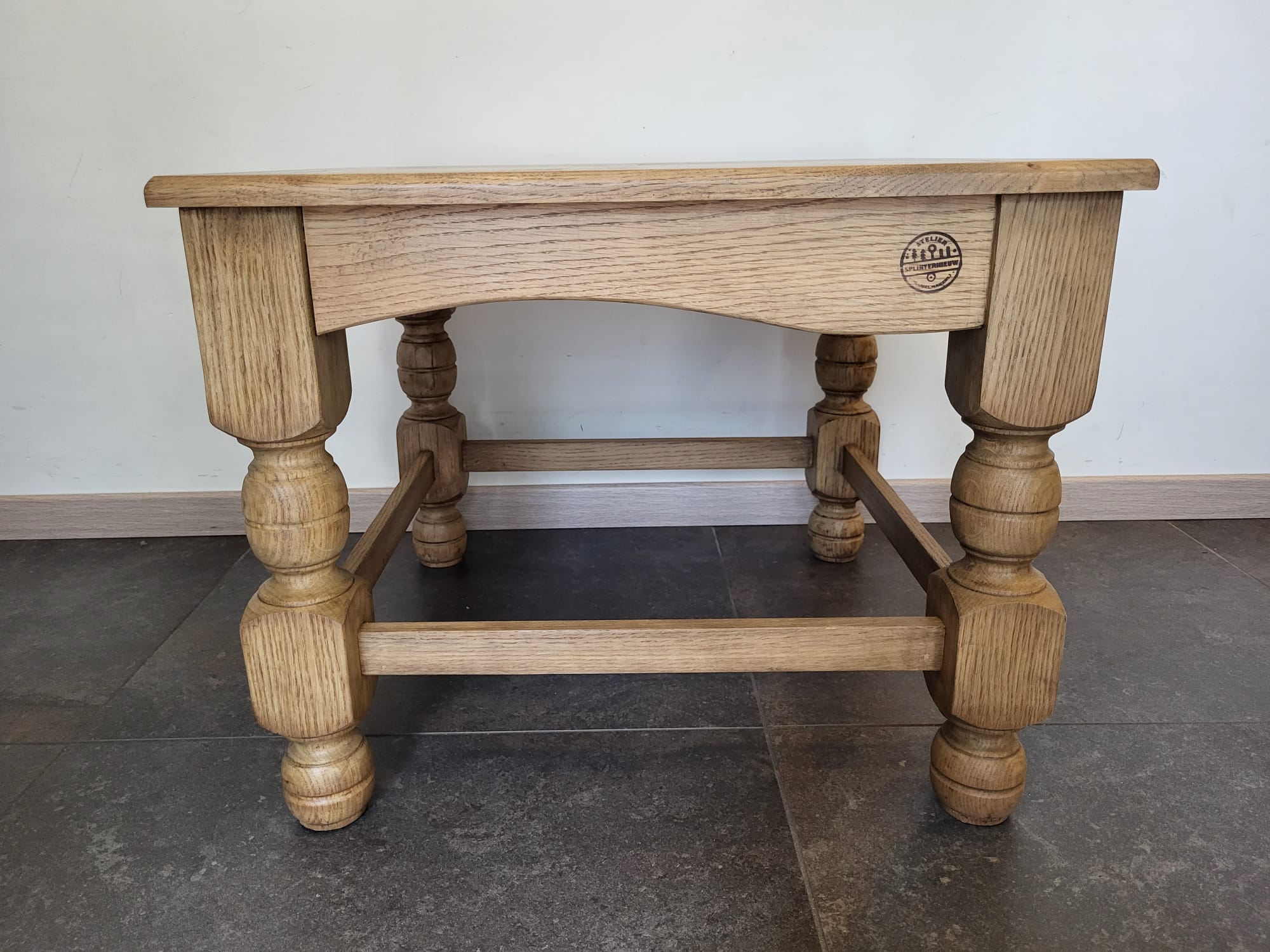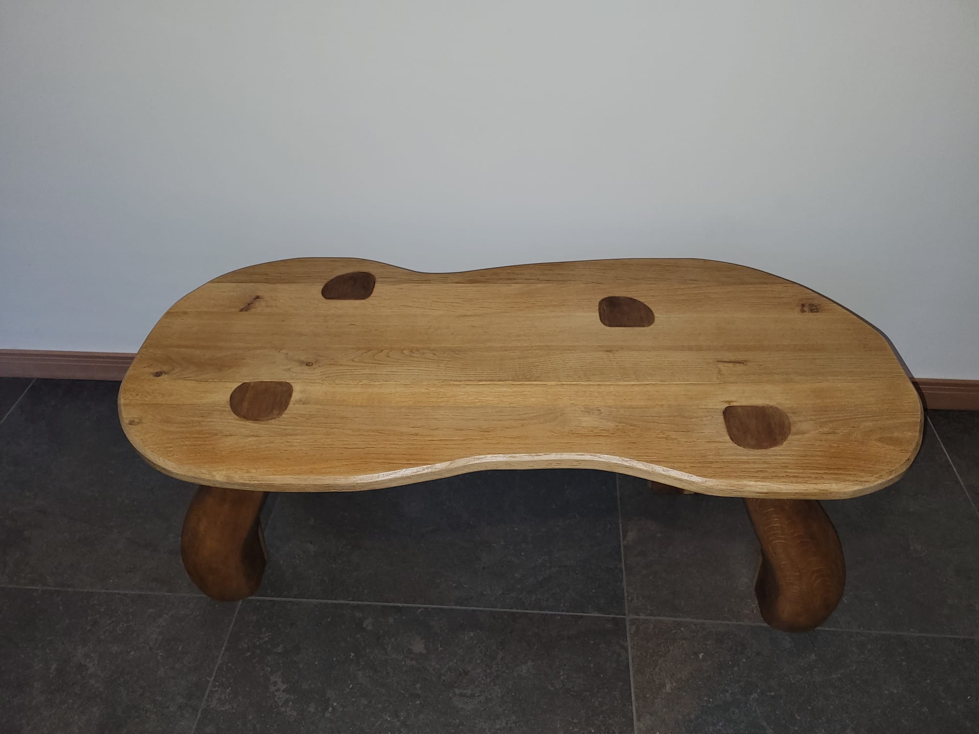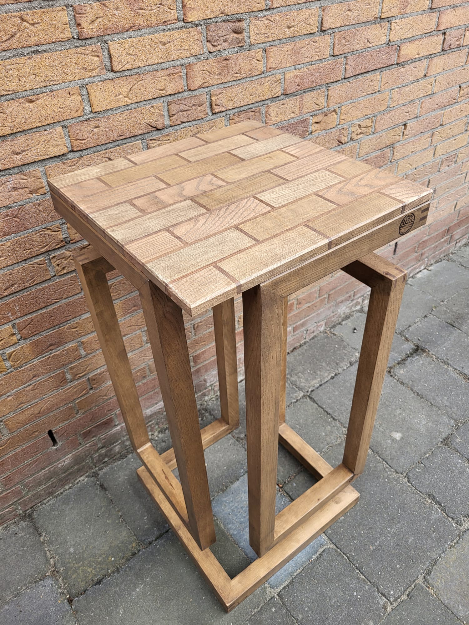 Karaktervol tafeltje van hergebruikt eikenhout. Gemaakt uit oude stoelen en een gebruikte salontafel. Duurzaam en uniek!