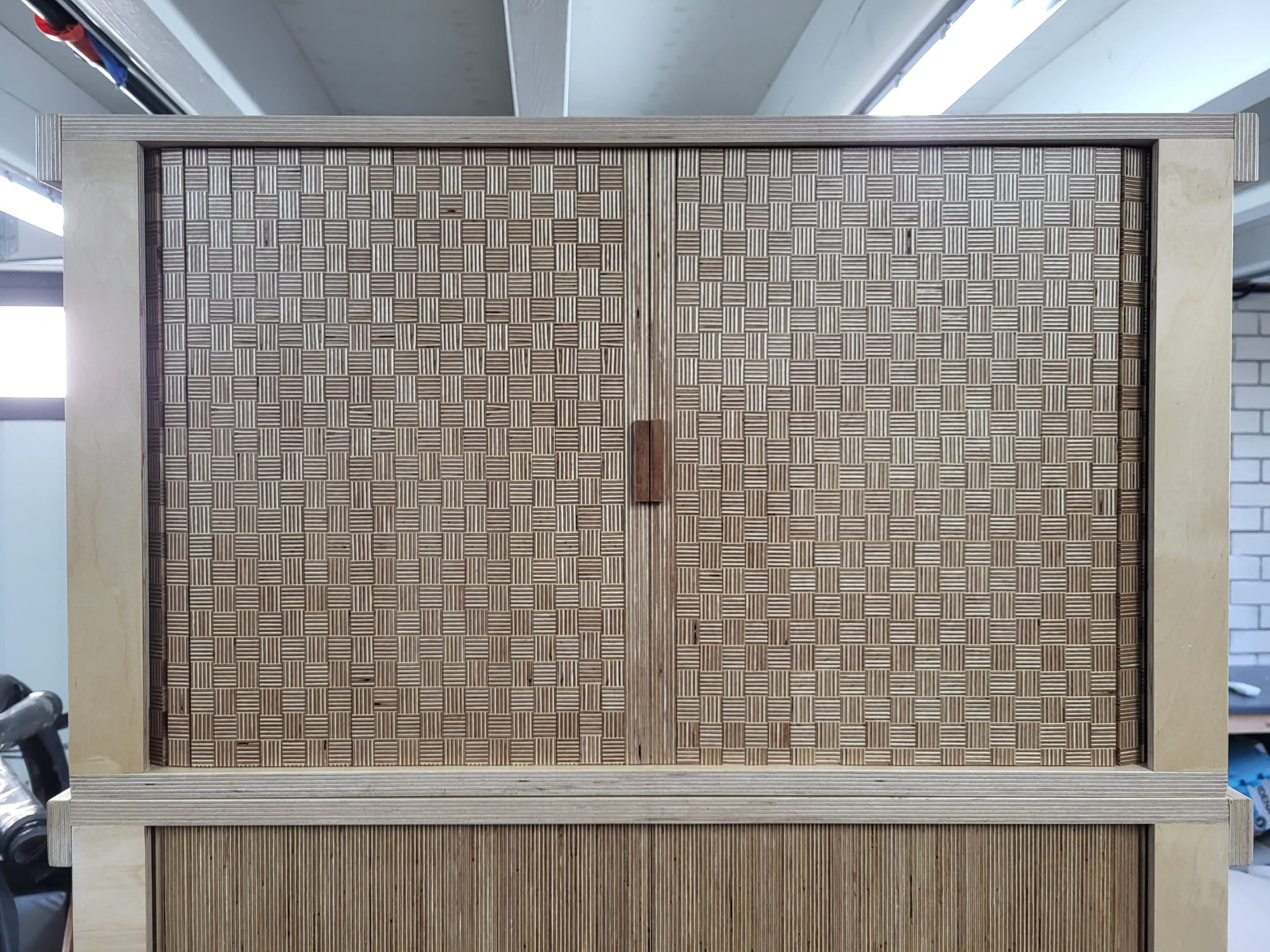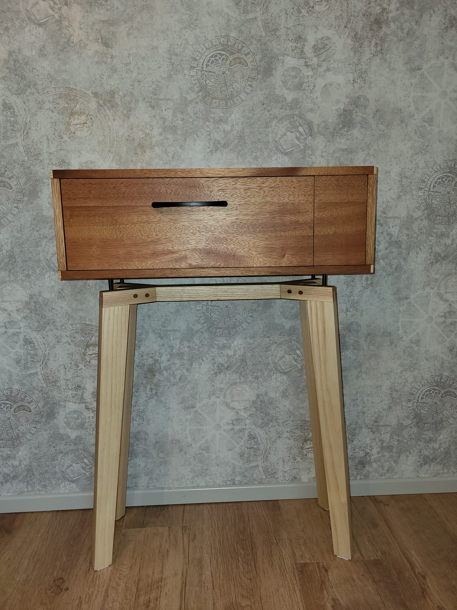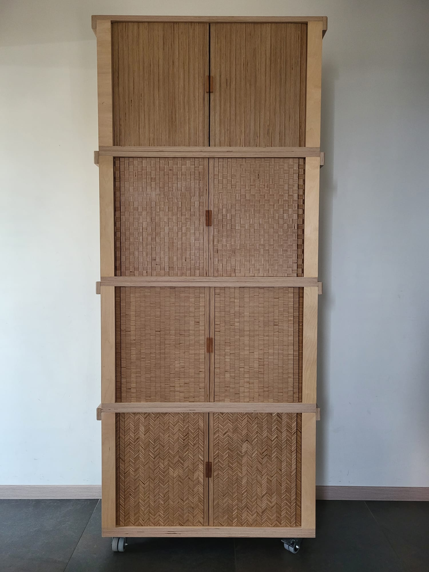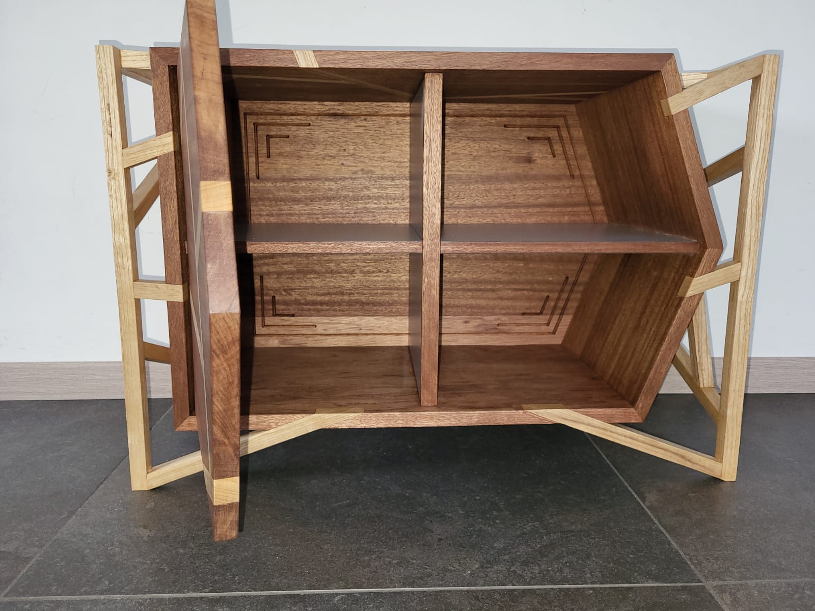 Een karaktervol kastje, vervaardigd uit gerecycled mahoniehout en omlijst met latjes van essenhout.
